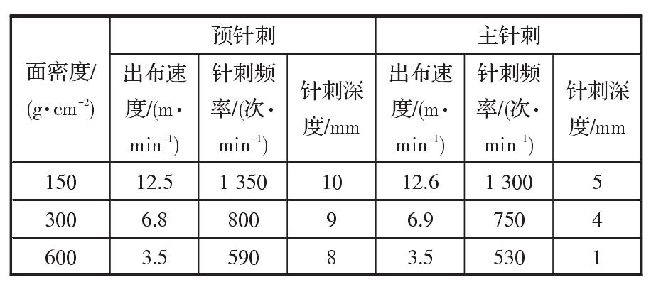 針刺頻率和針刺深度對布面強力有重要的影響。對于高強滌綸紡黏針刺土工布來講,布的面密度越大,生產(chǎn)速度越慢,針刺頻率越低;面密度偏小時,針刺工藝正好相反。針刺深度調(diào)整原則如下:①單絲強力較高時,針刺深度深一些;②面密度較大時,針刺深度淺一些;③預針刺深度比主針刺深一些。