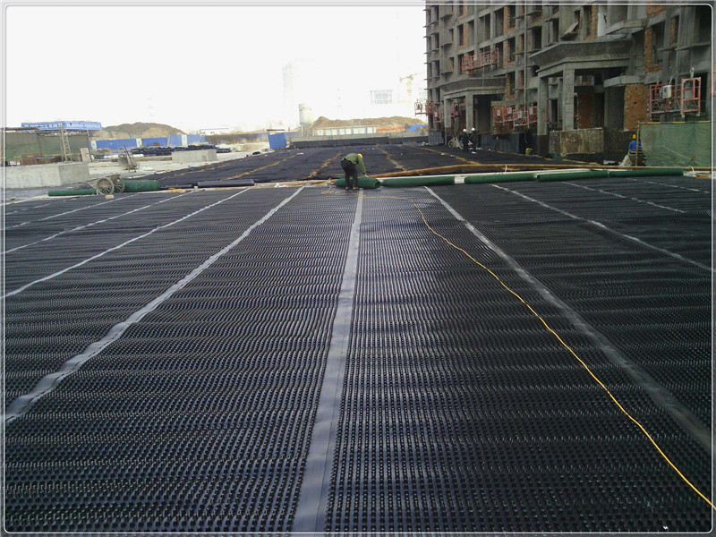 排水層的傳統(tǒng)構(gòu)造是采用厚度不小于100mm的卵石、碎石或陶粒,其中陶粒的通水性能略遜于前二者,傳統(tǒng)做法對屋面結(jié)構(gòu)會產(chǎn)生較大的承載壓力。隨著部分外資工程的建設(shè),(蓄)排水板從歐美引入我國,憑借其重量輕、施工便捷、造價低的優(yōu)勢逐漸成為(蓄)排水層的主流用料。(蓄)排水板又分為網(wǎng)格交織型和凹凸型兩種,其中由于常規(guī)的凹凸型(蓄)排水板售價略低并兼具一定的蓄水性能,目前應(yīng)用相對較多。